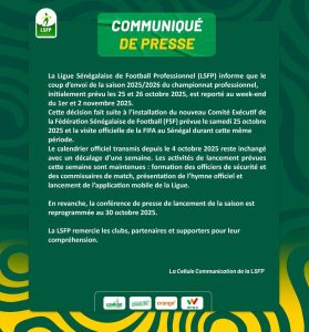 Ce mardi soir, la Ligue sénégalaise de football (LSFP) a fait savoir que le début de la saison 2025/2026, qui devait avoir lieu le 25 octobre, était repoussé.